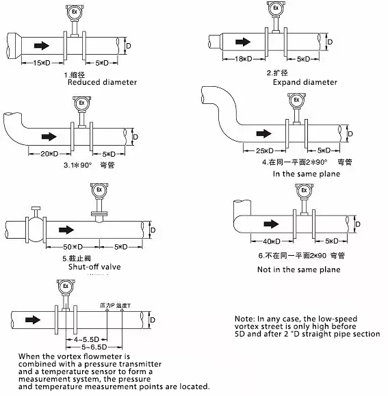 (1) If the liquid is measured, the vortex flowmeter should be installed on the pipeline where the medium to be measured should be completely filled.