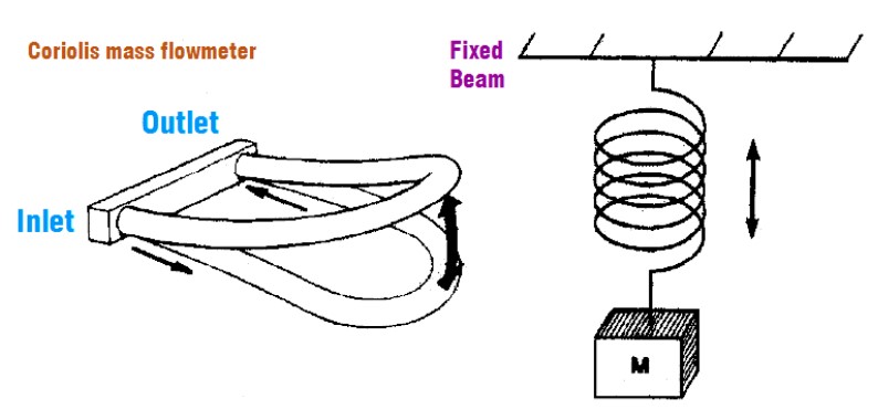 科里奥利质量流量计也能够给出流动流体的密度,其工作原理与弹簧和质量组件的原理相同,如下图所示。