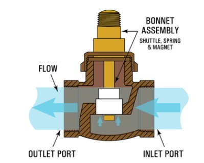 当流量达到开关的设定点时,磁梭克服了复位弹簧的向下力,并致动阀盖阀杆内的密封SPDT簧片开关元件。