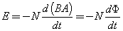 其中E是感应电流的电压,B是外部磁场,A是线圈的截面积,N是线圈的匝数,是磁通量,最后的负号表示电流根据伦兹定律,感应产生的磁场会产生另一个磁场,该磁场与线圈中磁场的积累相反。