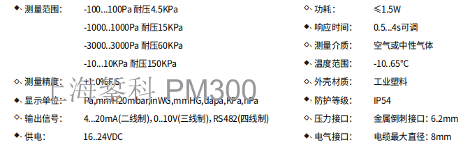 PM300于检测差压与表压压力,把压力值转 换为线性工业信号输出,满足 不同场合的微小压力 测量需要。