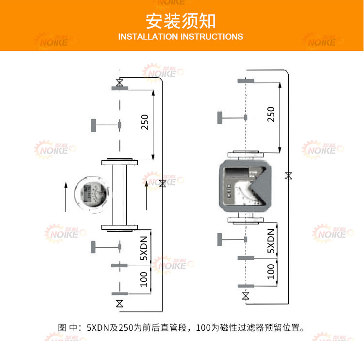 4、仪表的上下游管道应与仪表的口径相同。连接法兰或螺纹匹配。仪表上游直管段长度应保证是仪表公称口径的5倍下游直管段长度不小于250。