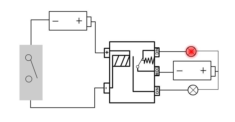 这个交互式动画向您展示了一个非常简单的场景,其中使用了N / O和N / C,根据是否有通过继电器的电源,打开红色或绿色光源。