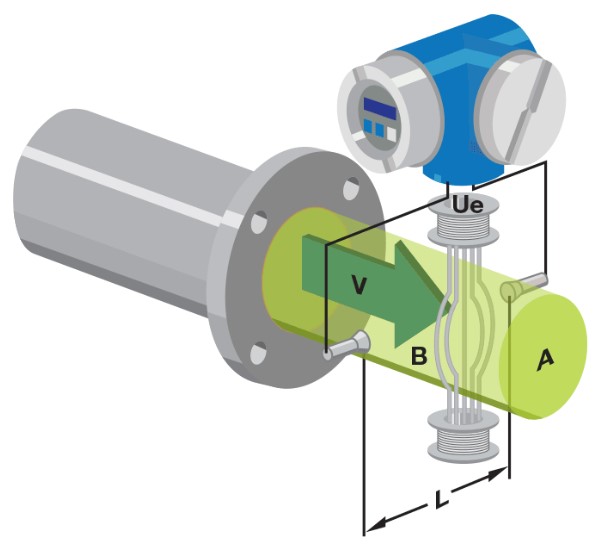 电磁流量计的工作原理基于法拉第的电磁感应定律。根据法拉第定律,当导电流体流过传感器的磁场时,在一对电极之间会产生与体积流量成比例的电动势,该电动势垂直于流动方向和磁场。电动势的幅度可以表示为: